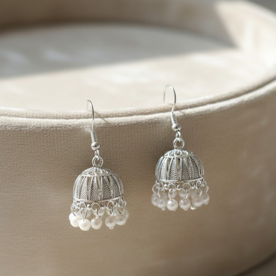 Design: A pair of dainty fish-hook style earrings featuring a refined, cage-like Jhumka dome.