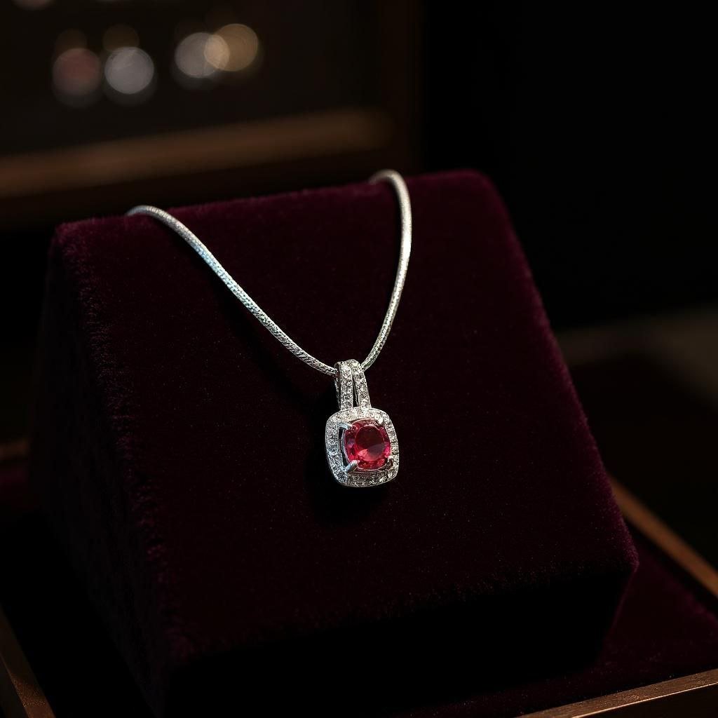 Ignite your style with the fiery “Crimson Ember Charm” necklace. This captivating piece features a rich, deep red simulated gemstone, radiating the passionate glow of a genuine ruby, beautifully enhanced by a brilliant halo of sparkling simulated diamonds. Set in a gleaming silver-tone finish and suspended from a delicate chain, this imitation necklace offers a luxurious and bold statement. Perfect for adding a touch of dramatic elegance to any outfit, it’s an accessible way to infuse your look with vibrant color and sophistication for any occasion.