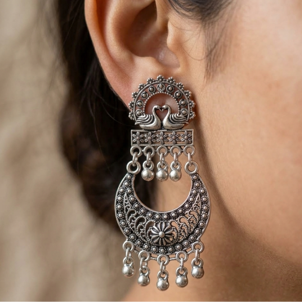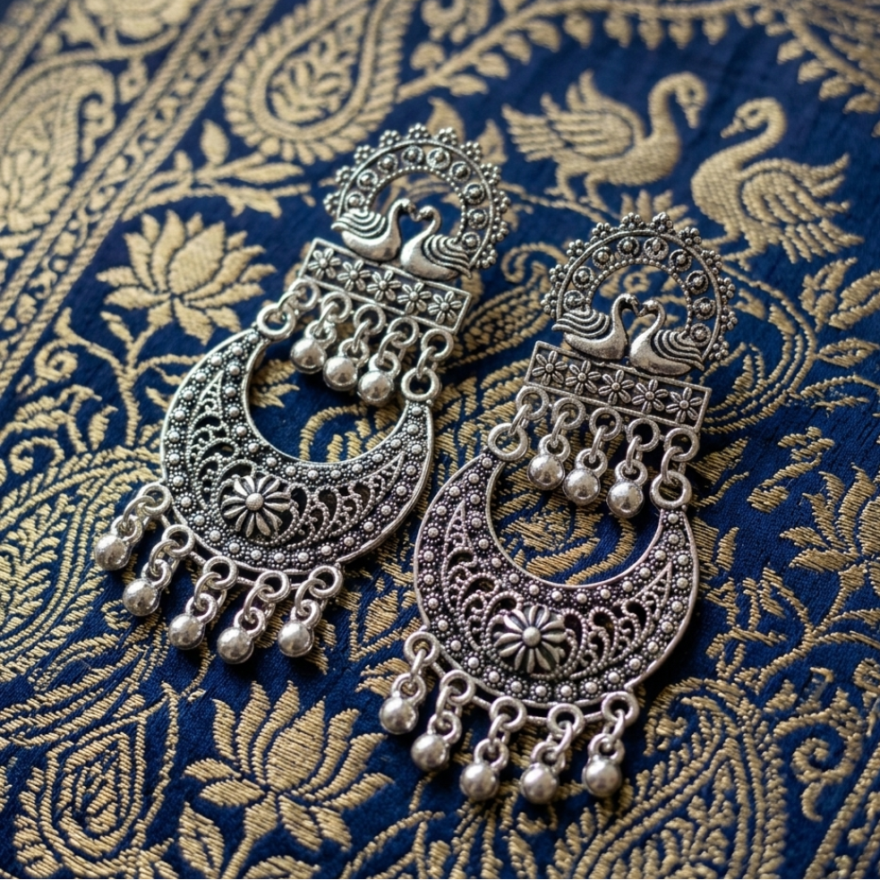 Embrace the timeless elegance of Indian heritage with these Divine Twin Peacock Chandbali Earrings. These statement pieces are a masterclass in traditional metalwork, featuring a regal twin peacock (Mayur) motif at the stud, symbolizing grace and beauty.