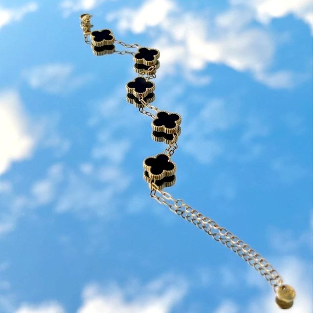 Elevate your everyday style with this timeless and sophisticated clover motif bracelet. Featuring five perfectly spaced, four-leaf clover charms in a deep black onyx-style finish, this piece is designed to bring a touch of luck and luxury to any outfit.