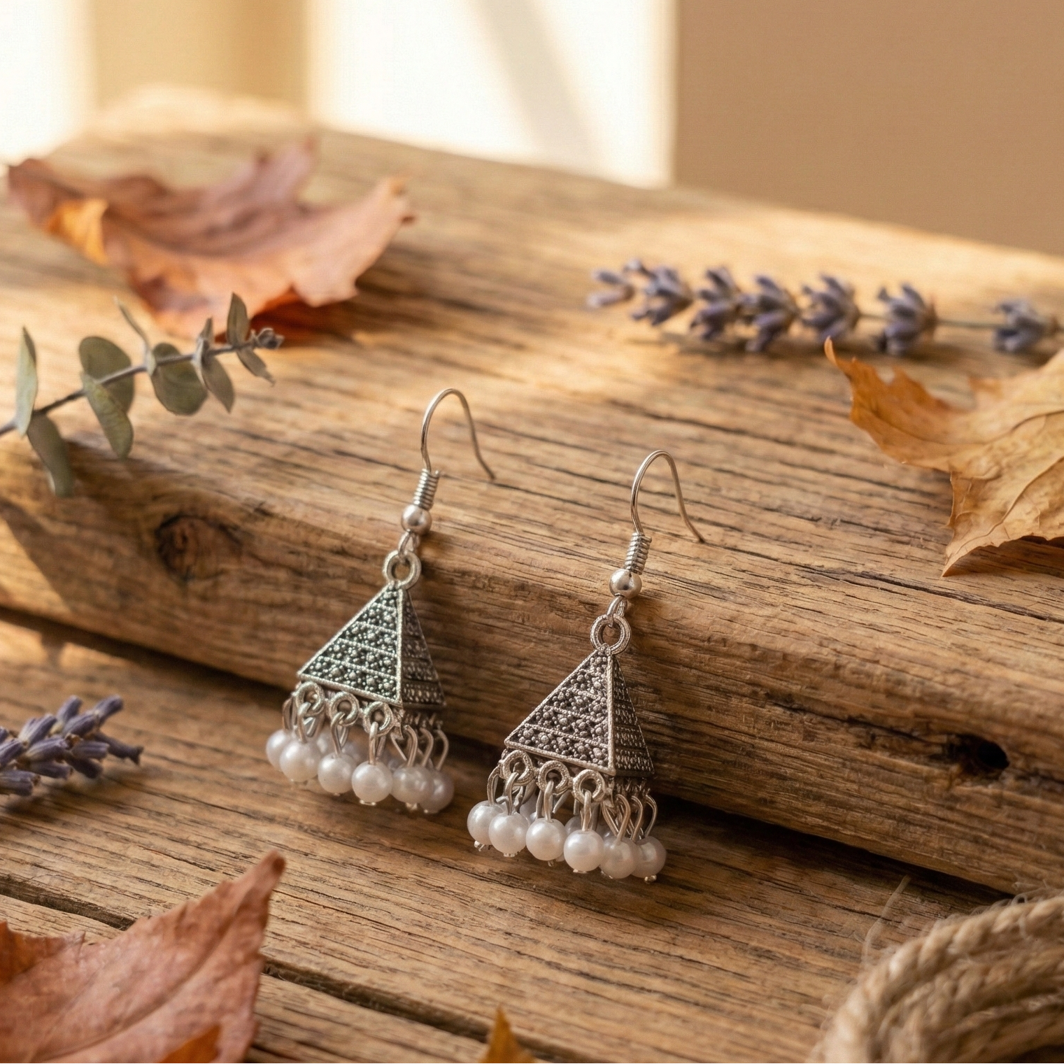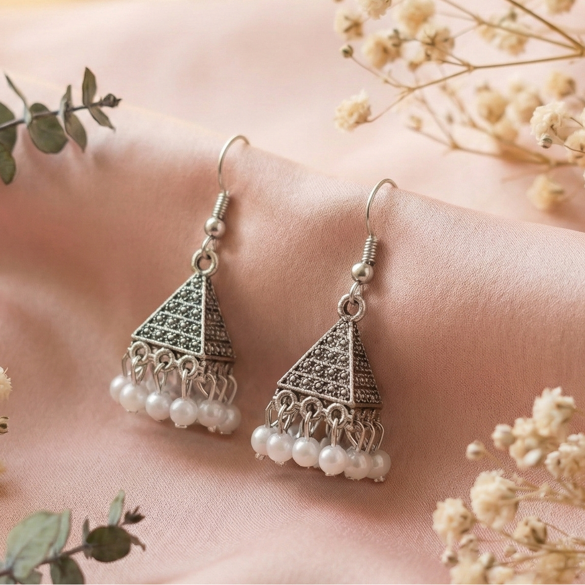 Elevate your everyday ethnic look with these unique earrings from Trinket Queen. Featuring a distinct pyramid-shaped dome with intricate oxidized-finish detailing, these lightweight jhumkas are trimmed with delicate white bead drops. A perfect blend of contemporary geometry and traditional charm.