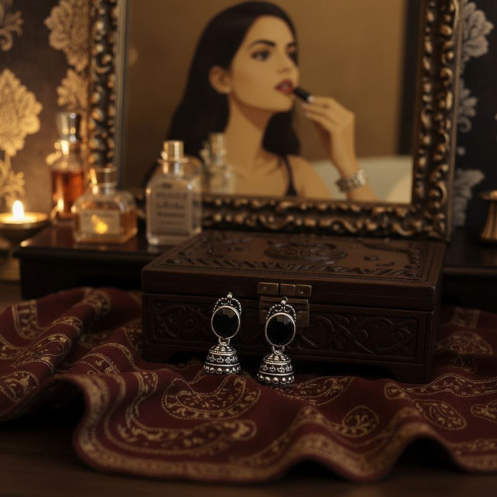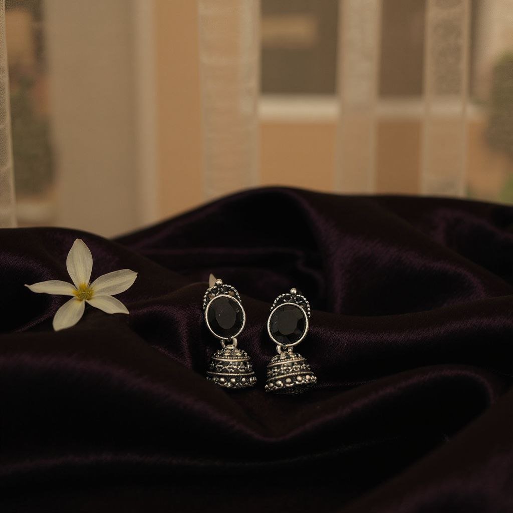 Capture the essence of vintage glamour with these meticulously crafted Silver Jhumka Earrings. The classic bell silhouette showcases exceptional craftsmanship, featuring multiple layers of fine etching and delicate silver beading. Anchored by a prominent dark stone, these earrings have a rich, antique patina perfect for elevating any evening wear or traditional ensemble. They come presented in a velvet gift box, ready for a special occasion.