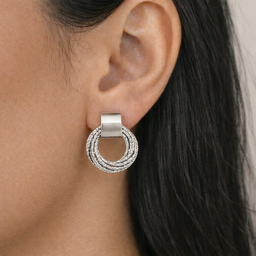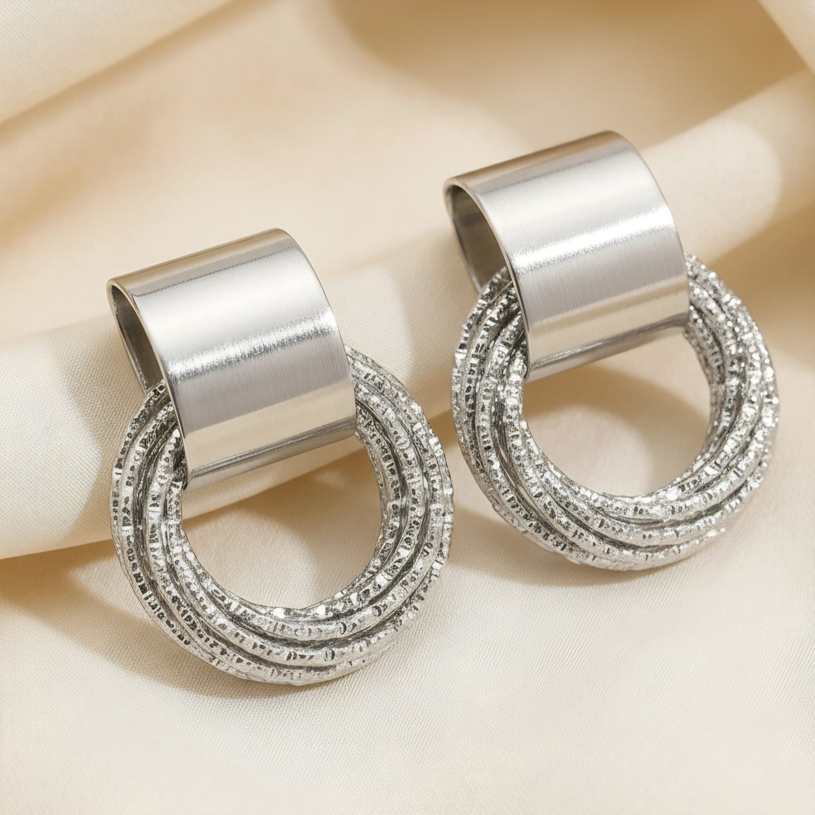 A sophisticated, high fashion design featuring a smooth, wide metallic band that secures a multi-layered, textured earing.