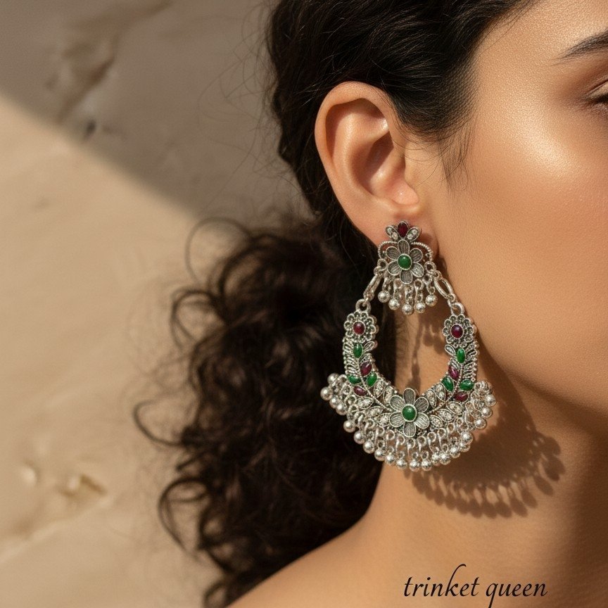The earrings are highlighted by vibrant emerald green and ruby red stones, which are set into the center of the flowers and along the curved edges. To complete the ethnic look, the bottom of the crescent is finished with a row of tiny, polished silver like beads (ghungroos) that add a touch of movement and classic charm.