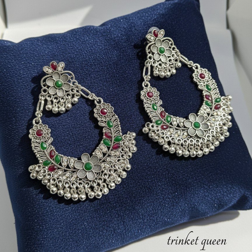 Oxidized Silver Chandbali Earrings with Red and Green Accents