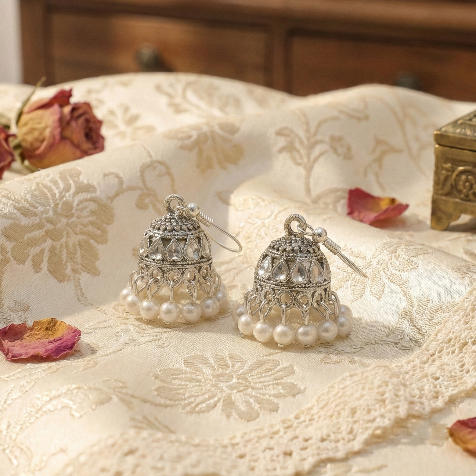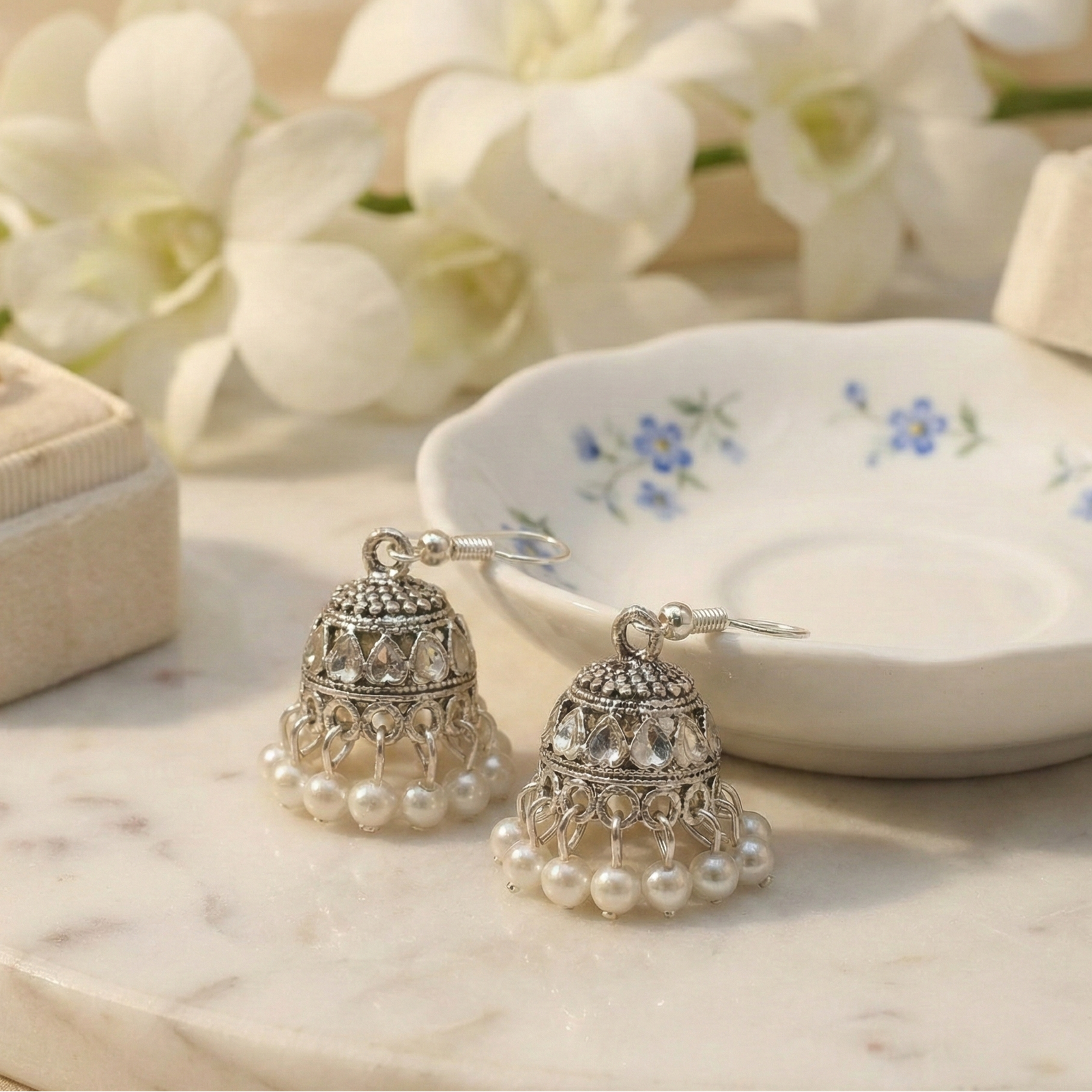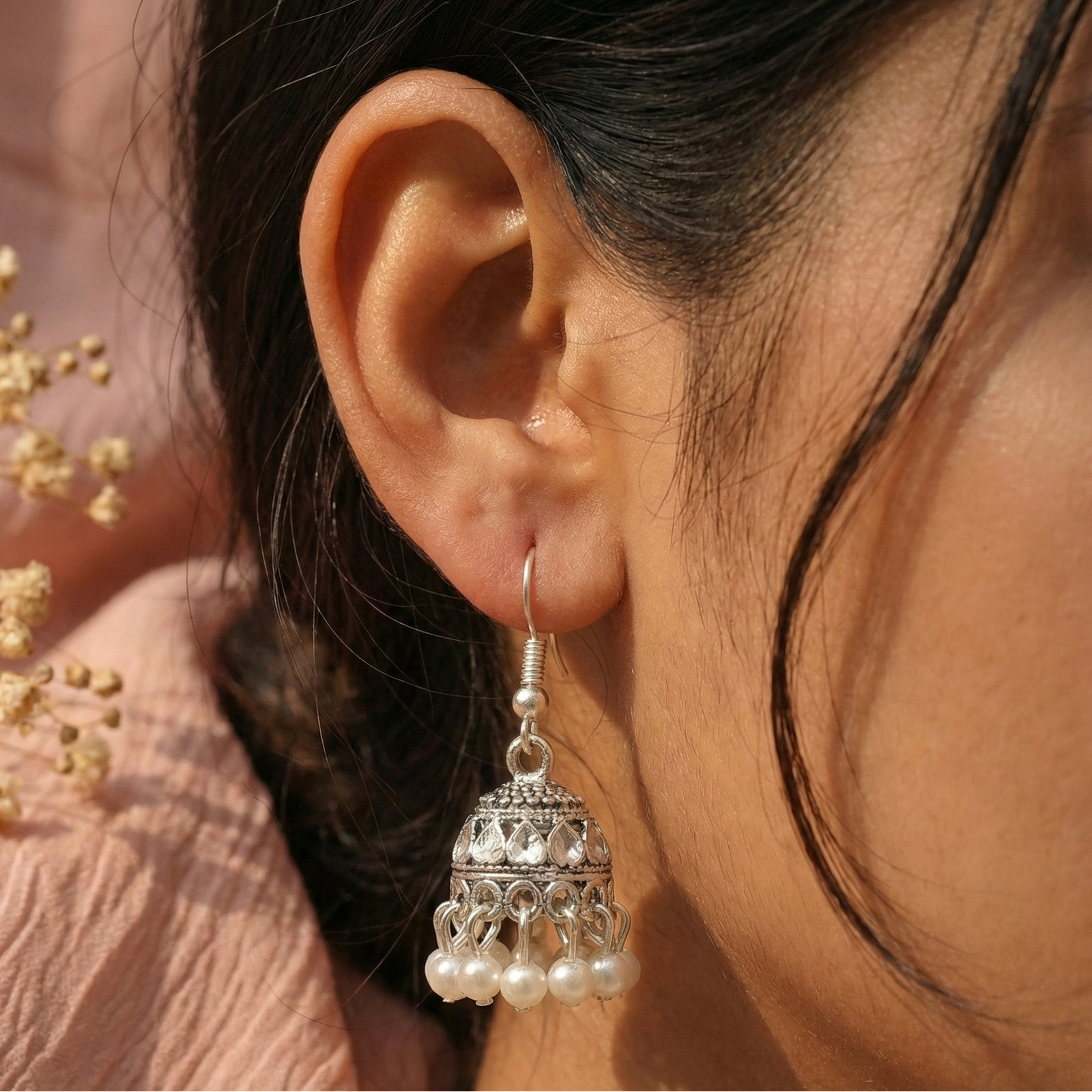 Add a touch of timeless grace to your collection with these stunning jhumkas from Trinket Queen. Expertly crafted with a premium oxidized finish, these earrings feature intricate textured detailing on the dome and are beautifully accented with a cluster of delicate pearl beads. Perfect for festive occasions or adding an ethnic flair to your everyday attire.
