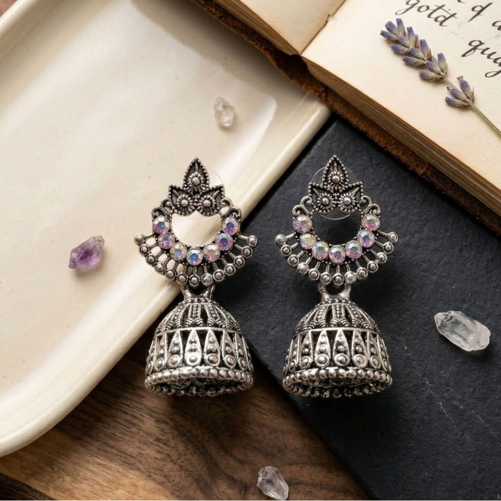 These exquisite Jhumka earrings are a stunning blend of traditional Indian craftsmanship and contemporary flair. Crafted from oxidized silver, the earrings feature an intricate, antique finish that highlights the delicate filigree and textured detailing.