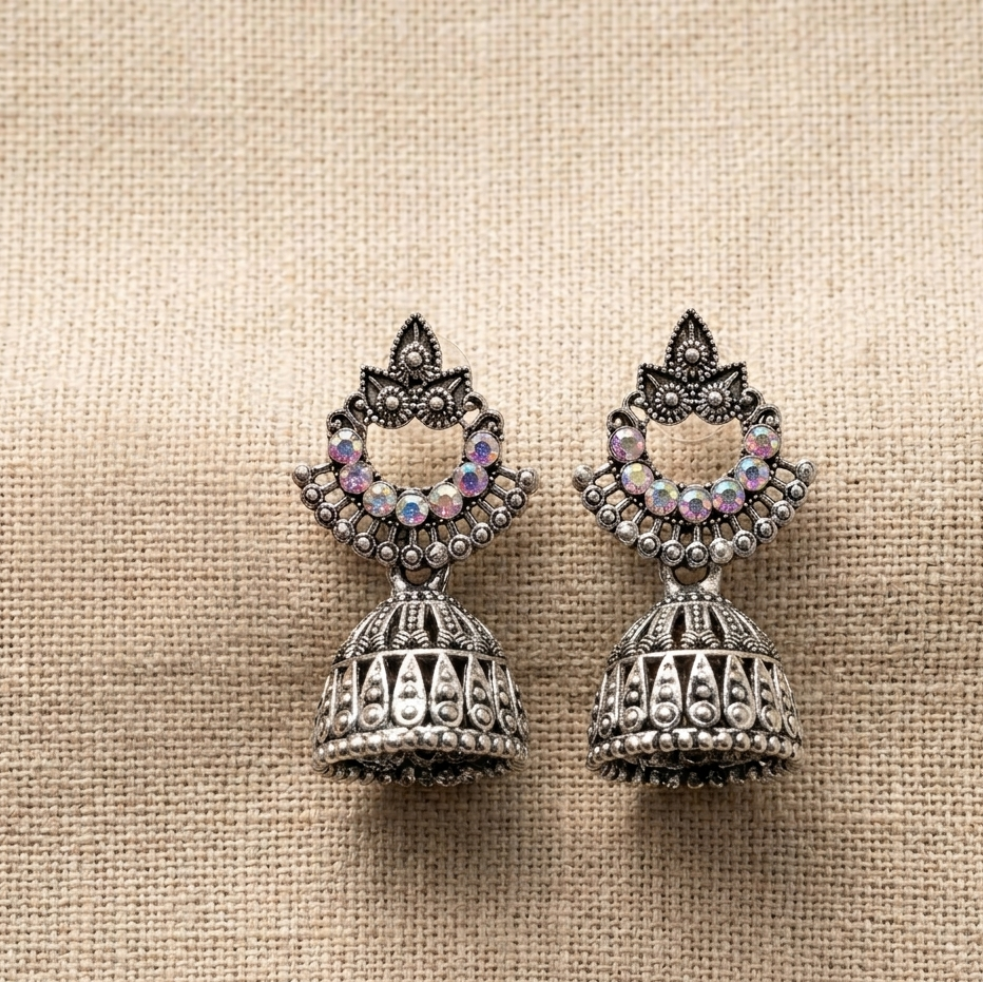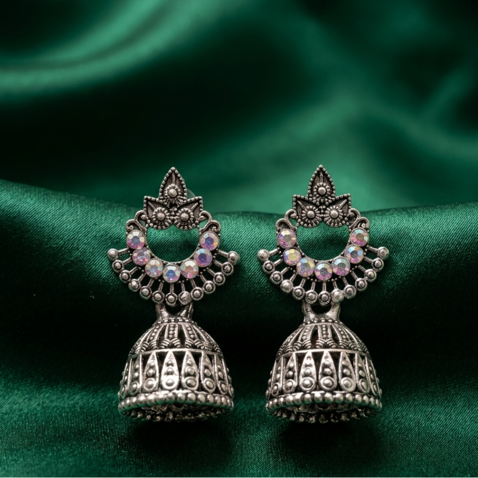 Vintage Oxidized Silver Jhumka Earrings with Iridescent Accents