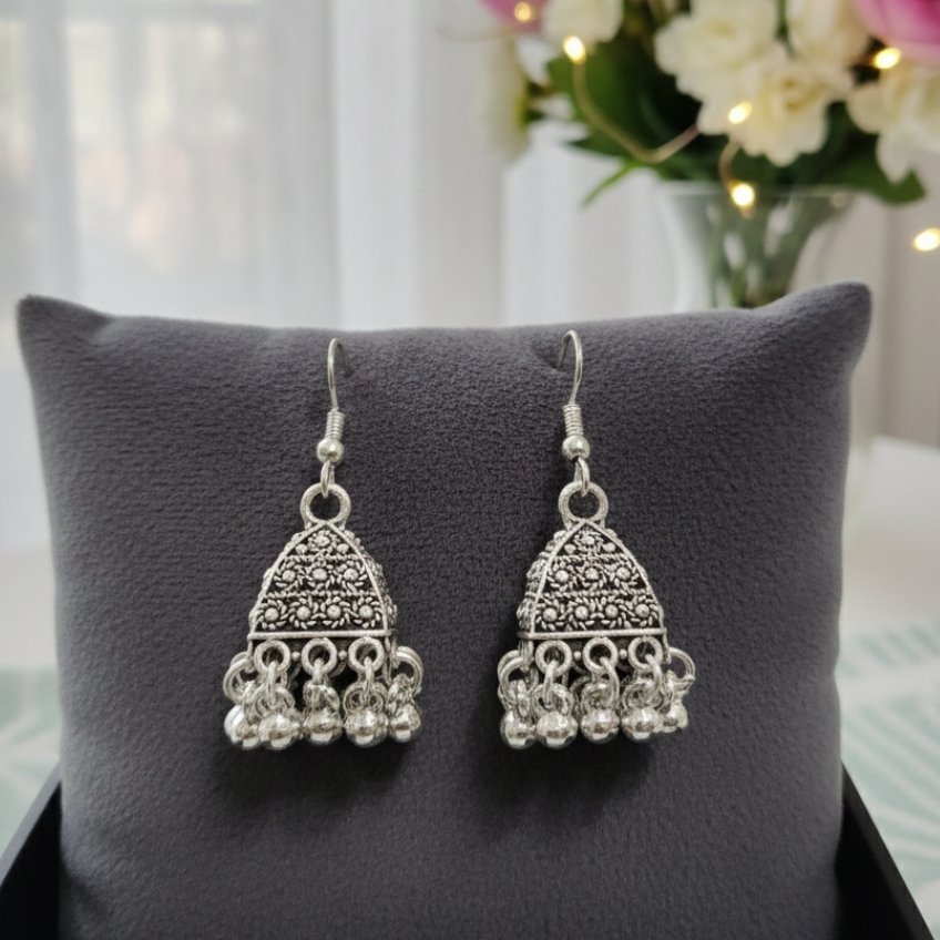 These exquisite drop earrings feature a traditional oxidized finish, blending ethnic charm with timeless vintage appeal. Displayed on a soft grey jewelry cushion, the intricate craftsmanship of these Jhumka-style earrings makes them a standout accessory for cultural celebrations or boho-chic styling.